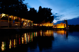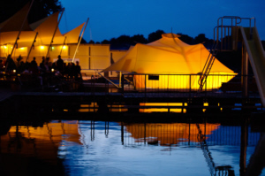 Publikum und Bühne im Naturbad Falkenwiese im Laufe des Abends.